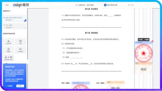 设定签署位置与参数:通过拖拽等方式,在合同上指定各签署方的签字/盖章区域,并设置签署顺序、合同有效期等。