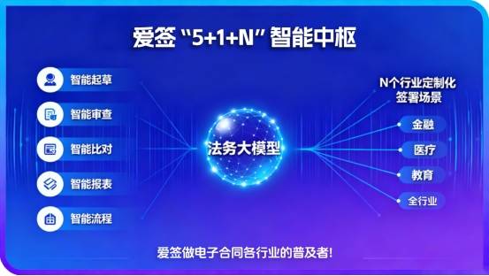 “5+1+N”战略赋能行业:“爱签”宣传的“5+1+N”智能中枢体系,其核心是通过五大AI能力(如智能起草、审查、比对、报表、流程),结合一个法务大模型,最终拓展出N个行业的定制化签署场景与解决方案。这体现了其致力于成为电子合同在各行各业普及者的定位,让技术能精准适配不同行业的特殊需求。